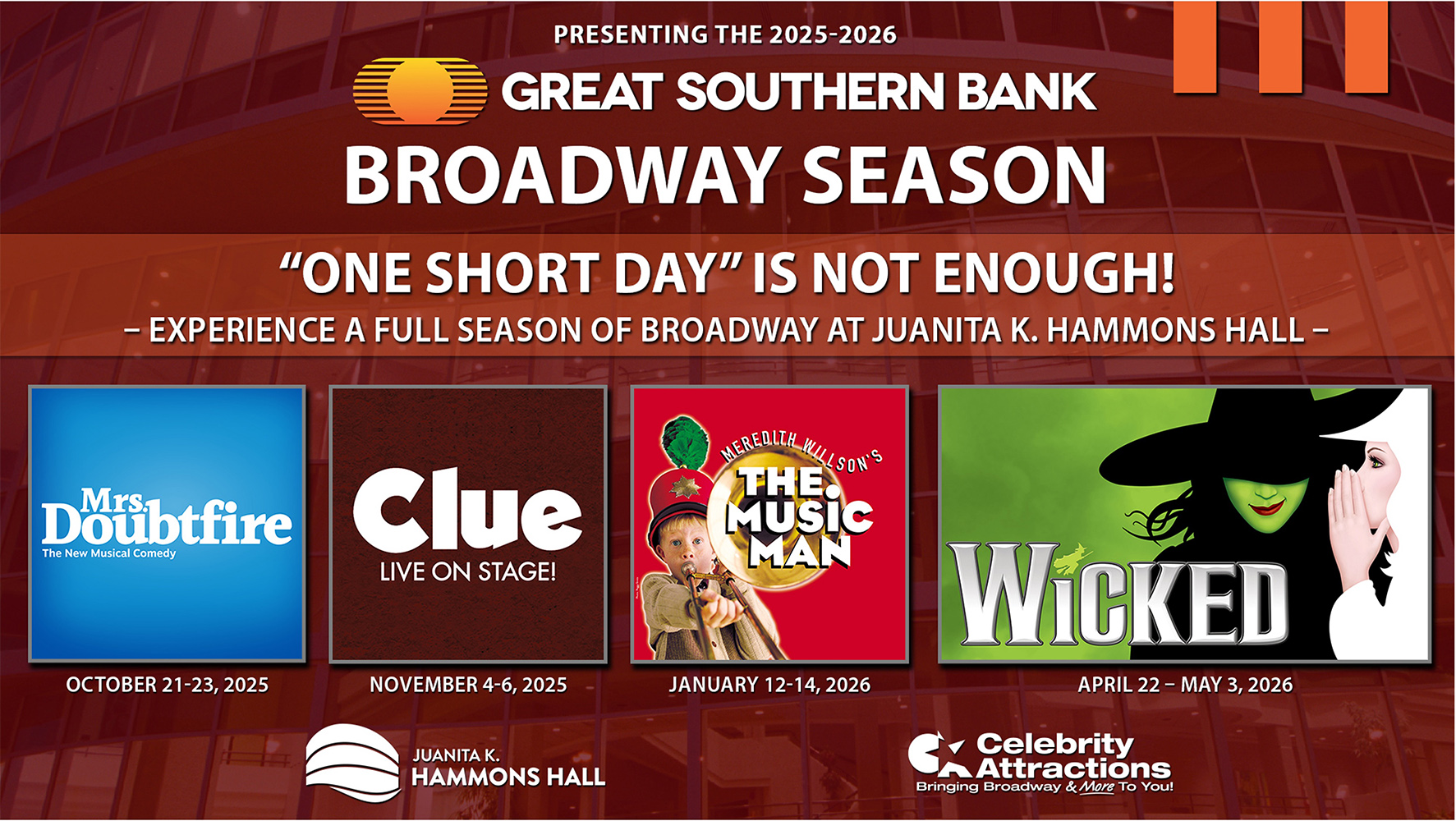 Buy additional tickets for series shows before the general public. Our Broadway Subscribers always have the first opportunity to purchase tickets to our Broadway Bonus Add-on Productions and other shows and concerts coming to Juanita K. Hammons Hall.